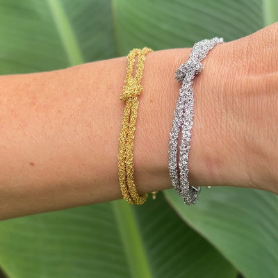 Hand made in Italy using delicately woven threads of gold chain with two strands knotted together.